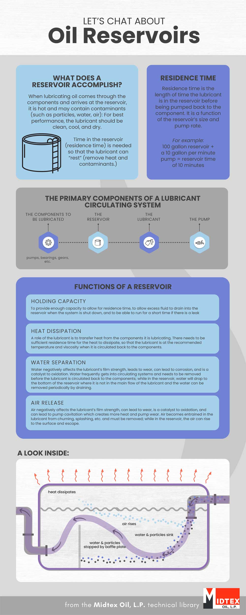 When lubricating oil comes through the components and arrives at the reservoir, it is hot and may contain contaminants (such as particles, water, air): For best performance, the lubricant should be cool, clean, and dry. Time in the reservoir (residence time) is needed so that the lubricant can “rest” (remove heat and contaminants.)